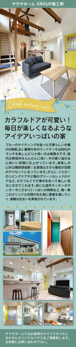 ブルーのサイディングが魅力のO様邸。広いウッドデッキでBBQやランチを楽しめる開放的な空間。無垢材や梁表しのLDK、カラフルなドアが彩るおしゃれな住まい。造作カウンターや照明にもこだわった唯一無二の家。