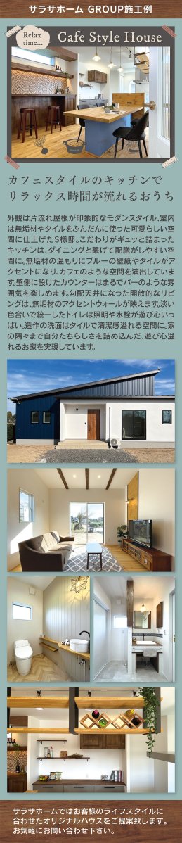 片流れ屋根が特徴のモダンなS様邸。無垢材やタイルを活かした可愛らしい空間が魅力。カフェ風のキッチンやバーのようなカウンター、開放的な勾配天井リビングが心地よさを演出。遊び心とこだわりが詰まった理想の住まい。