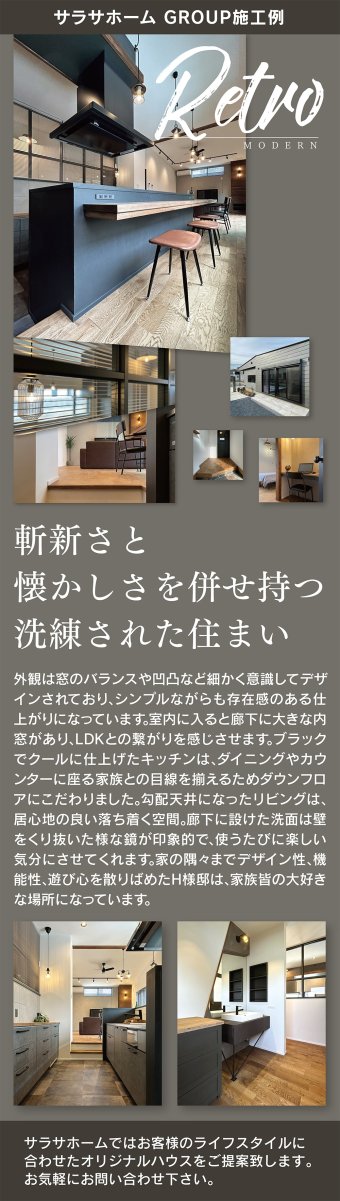 外観は窓の配置や凹凸にこだわり、シンプルながら存在感のあるH様邸。内窓やダウンフロア、勾配天井などデザイン性と快適性を兼ね備えた住まいです。