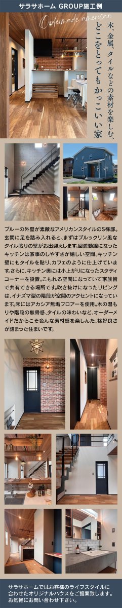 木・金属・タイルなど素材感を楽しめる、アメリカンスタイルのS様邸。回遊動線のキッチンやスタディコーナー、吹き抜けリビングが、かっこよさと暮らしやすさを両立した住まいです。