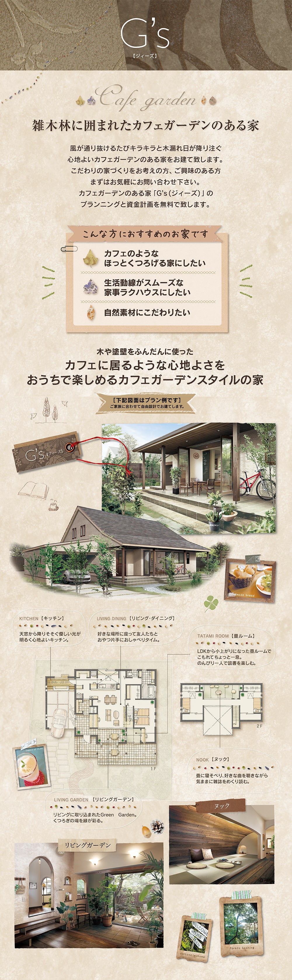 忙しい毎日の中でもほっとくつろげる素敵なカフェガーデンや、家事時短を考えたスムーズな動線の間取り、身体に優しい自然素材に包まれた心地よいプランです。 こだわりの家づくりをお考えの方、ご興味のある方、まずはお気軽にお問い合わせ下さい。 カフェガーデンのある家「G’s(ジィーズ)」のプランニングと資金計画を無料で致します。
